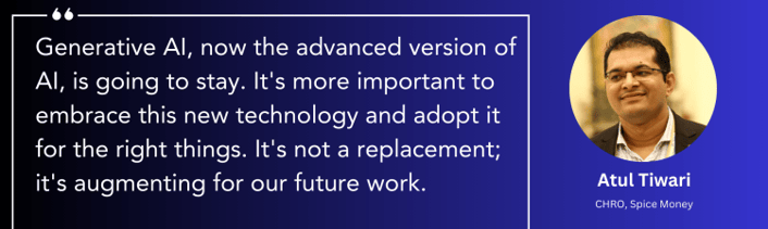 Mukul notes how Gen AI can be leveraged to find the right fit for organizations from the vast talent pool based on the intellectual capability and maturity level of a company, to ensure effective HR decisions made for various HR processes – hiring, succession planning, workforce eligibility, growth structure and more.