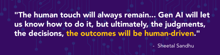 The panel unanimously agreed that while Generative AI can augment HR capabilities, the human element remains irreplaceable. Simin Askari stressed the importance of critical thinking and emotional intelligence, aspects that AI cannot replicate. The consensus was that AI should be viewed as a tool to enhance, not replace, human interactions within HR practices. Sheetal Sandhu envisioned Generative AI as an integral part of daily operations, akin to the internet or electricity, emphasizing its role in decision-making while ensuring that the final decisions and strategic directions are human-driven. The blend of Generative AI and human judgment forms the cornerstone of future HR practices, ensuring that technology enhances rather than diminishes the human touch.