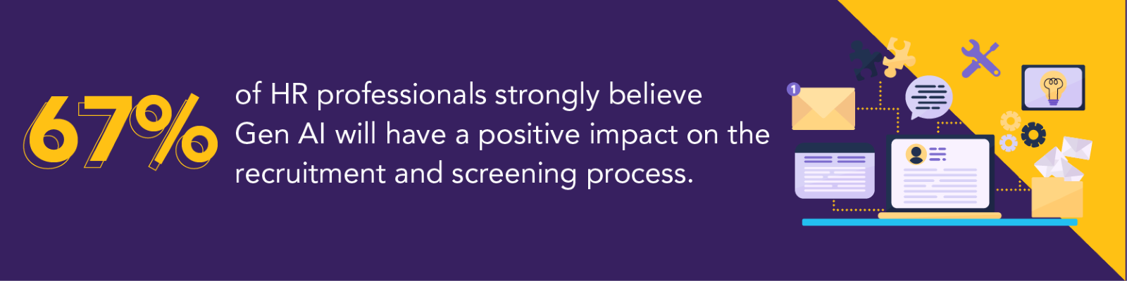 - Talent Acquisition and Recruitment: AI can streamline the creation of compelling job postings, automate candidate communication, and even assist in initial screening processes. This has an estimated value potential of 20%. Moreover, 67% of HR professionals believe AI will positively impact recruitment and screening, highlighting its perceived potential to improve efficiency and effectiveness.